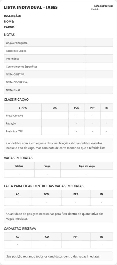 Listas de Classificação atualizadas a cada etapa do certame. Elaboradas seguindo os critérios do Edital e resultados publicados pela IDCAP e IASES. E atualizadas conforme a divulgação de novos resultados oficiais e mudanças nas diretrizes de convocação.
