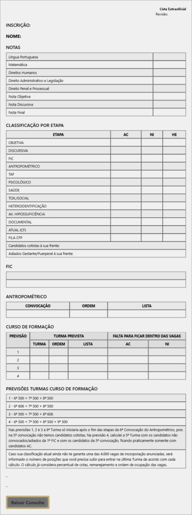 Listas de Classificação atualizadas a cada etapa do certame. Elaboradas seguindo os critérios do Edital e resultados publicados pela FGV e PMERJ. E atualizadas conforme a divulgação de novos resultados oficiais e mudanças nas diretrizes de convocação.