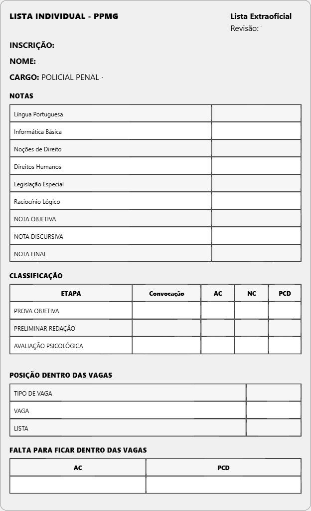 Listas de Classificação atualizadas a cada etapa do certame. Elaboradas seguindo os critérios do Edital e resultados publicados pela AOCP e SEJUSP. E atualizadas conforme a divulgação de novos resultados oficiais e mudanças nas diretrizes de convocação.